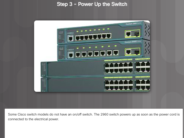 Switch Cisco hadir dengan konfigurasi awal dan hanya perlu diberikan informasi keamanan dasar sebelum terhubung ke jaringan. Elemen yang biasanya dikonfigurasikan pada switch LAN meliputi: nama host, informasi alamat IP manajemen, kata sandi, dan informasi deskriptif.